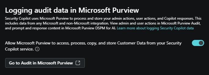 - To enable Purview for managing Security Copilot data (audit, retention, eDiscovery), the “Allow Microsoft Purview to access, process, copy, and store Customer Data from your Security Copilot service” option must be enabled.